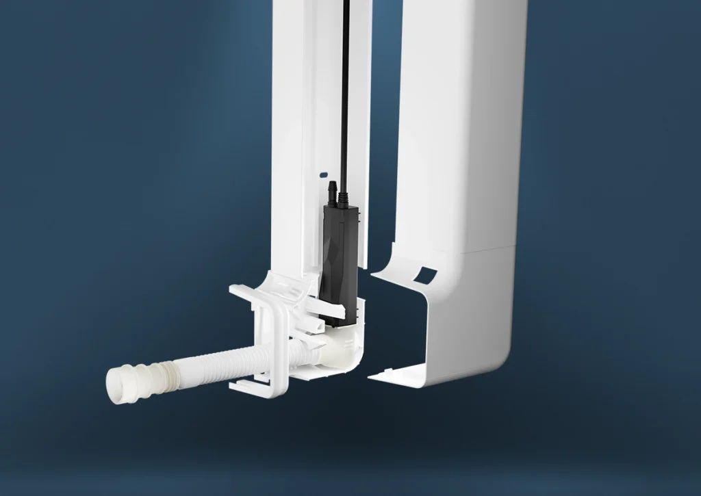 Die erste REFCO-Kondensatpumpe mit komplettem Kanalsystem für eine durchdachte, platzsparende Montage im Eckkanal. Die raffinierte Konstruktion ermöglicht eine stabile, verdeckte Installation nahe am Klimagerät – für eine saubere Optik und leisen Betrieb.